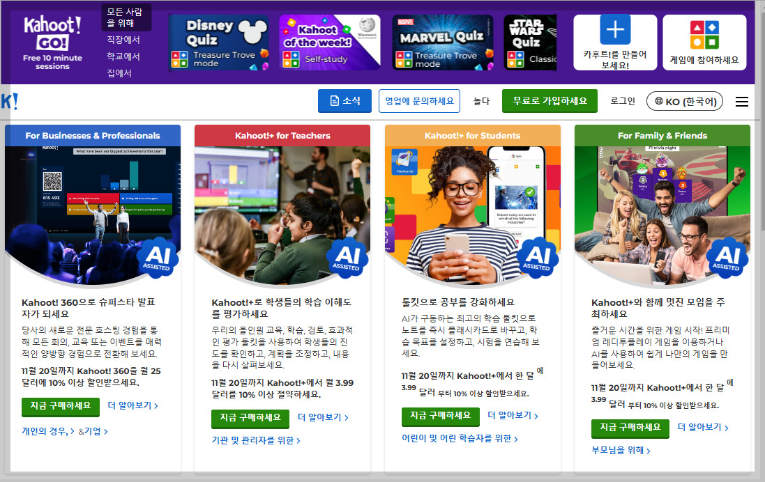 - 팀 빌딩 툴로 활용: Kahoot!의 게임 요소를 이용해 직원 교육이나 팀워크 강화 활동에 활용하세요.