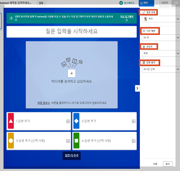 ▶ 퀴즈를 만들때 사용되는 질문유형 / 시간 제한 / 포인트 / 답변 유형 등을 골라 저장합니다.