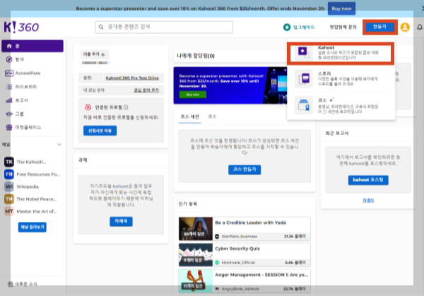 카훗 무료 계정을 생성하여 퀴즈 만들기 옵션을 선택 후,