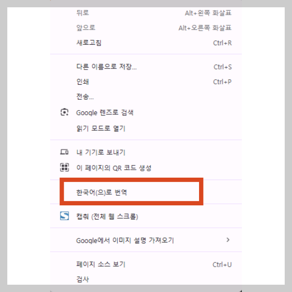 오른쪽 마우스 클릭하면 [한국어(으)로 번역]을 클릭하여 홈페이지를 한국어로 나올수 있게
