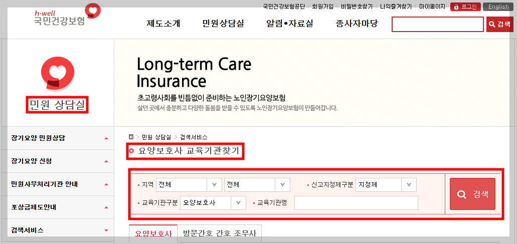홈페이지 상단의 '민원상담실' 메뉴에서 '검색서비스'를 선택한 후, '요양보호사 교육기관'을 클릭합니다.