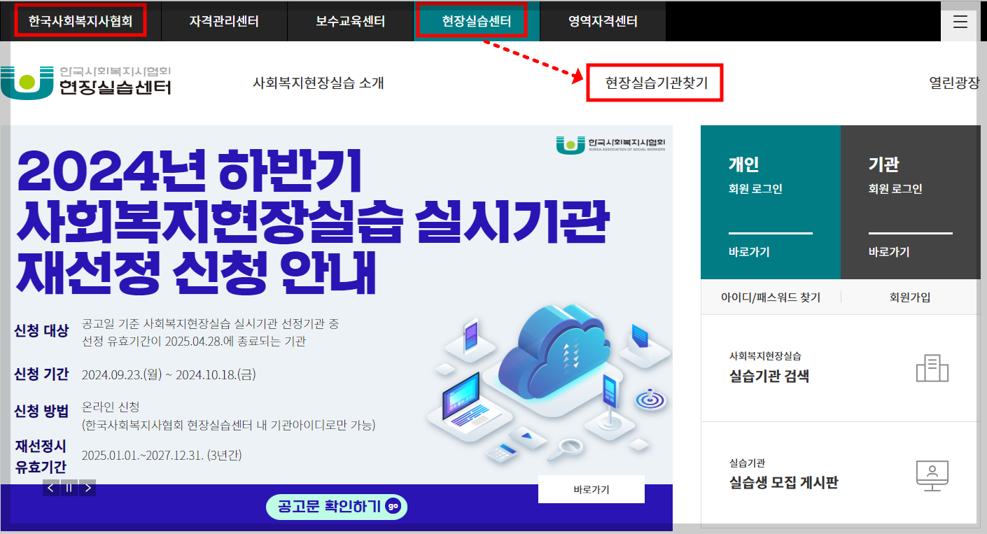 ※실습 가능한 기관 목록은 한국사회복지사협회 홈페이지의 현장실습센터에서 확인이 가능합니다.