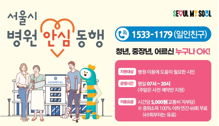 서울시: ‘병원 안심동행 서비스’를 통해 병원 방문이 어려운 시민을 지원하고 있습니다.