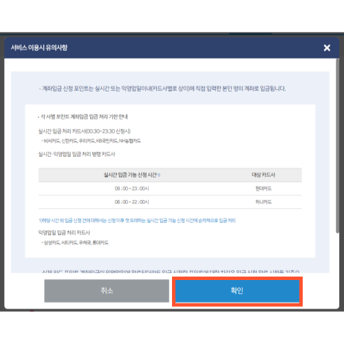 각 카드사별 실시간 입금 가능시간이 다를 수 있습니다.