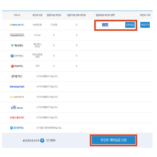 2. 입금가능 포인트를 확인해서 입금요청 포인트에 전부입력하기 클릭