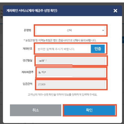 4. 본인명의 은행계좌, 계좌번호 입력 후 인증