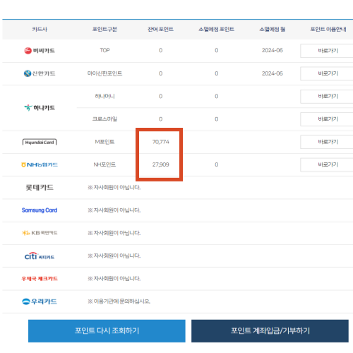 ※현대카드와 농협카드의 잔여포인트가 확인됩니다.