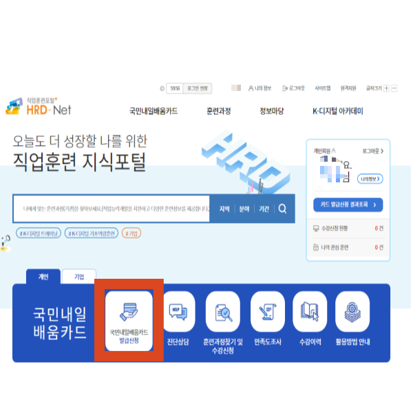 상단 카테고리 >>국민내일배움카드 >> 국민내일배움카드 발급 >> 발급신청 순으로 클릭