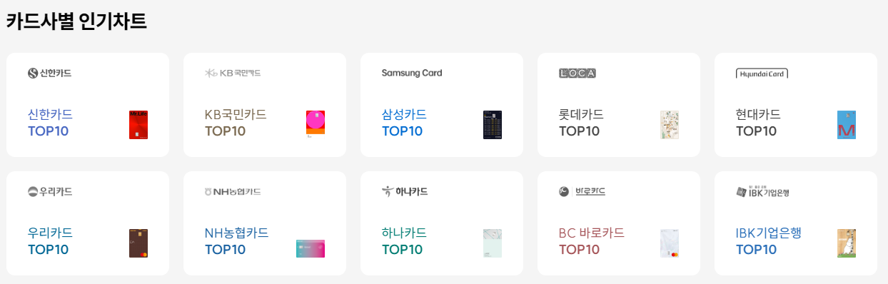국내 모든 카드사의 신용,체크카드를 한 곳에서 한눈에 비교, 검색할 수 있습니다.