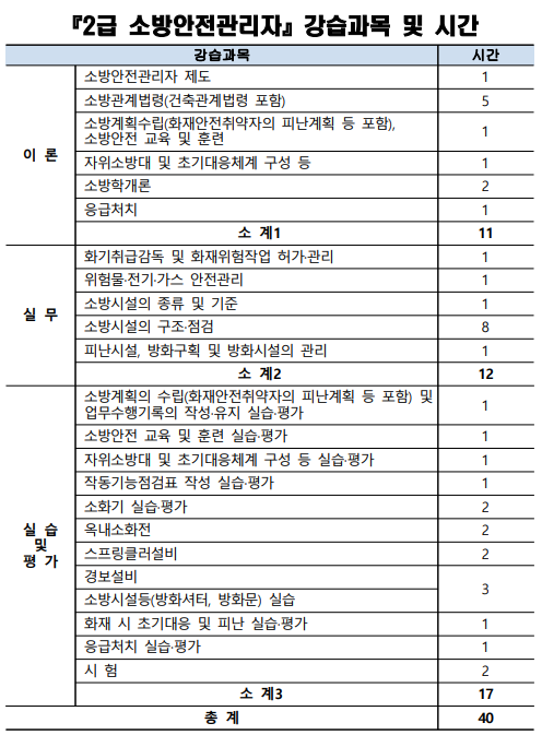 | 2과목 | 소방시설 (소화설비, 경보설비, 피난구조설비)의 점검,실습,평가 |