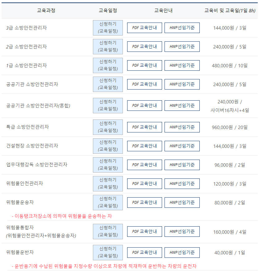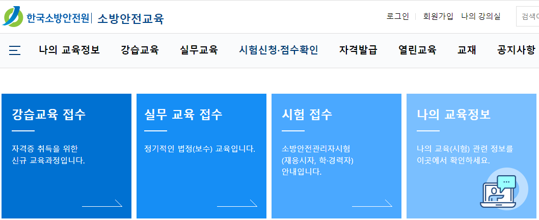 주로 소방안전관리자를 대상으로 하고 있고 급수별로 다양한 등급의 교육이 제공됩니다.